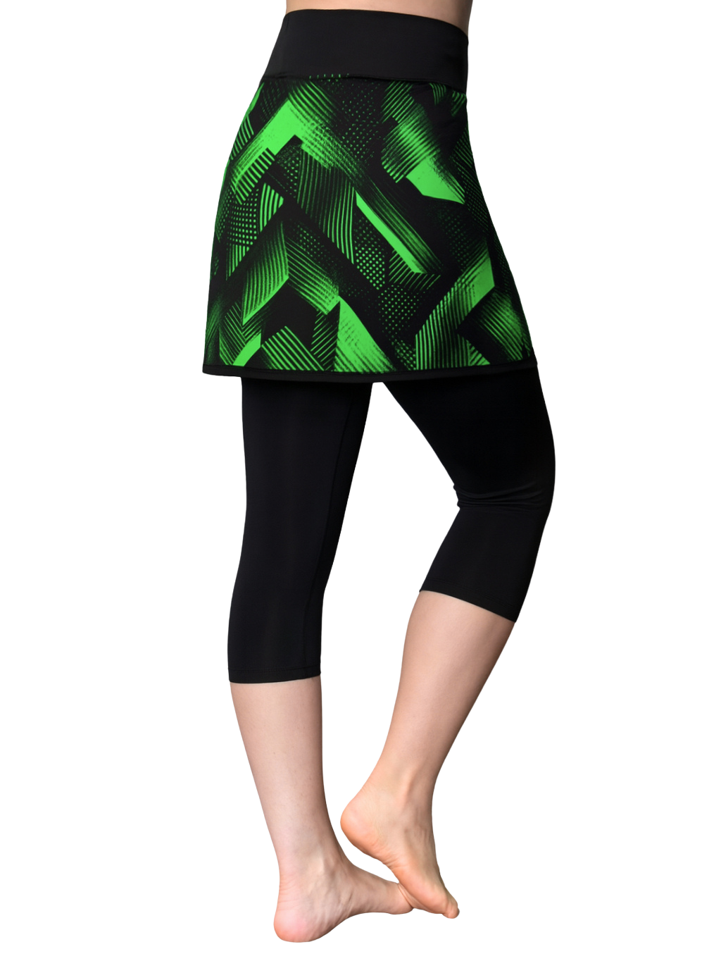 Naše sportovní sukně s legínami kombinuje to nejlepší z obou světů. Barevný geometrický potisk v zeleno-černé kombinaci dodá energii tvému tréninku a kvalitní elastický materiál zajistí, že se budeš cítit pohodlně a volně. Perfektní na sport i aktivní volný čas.