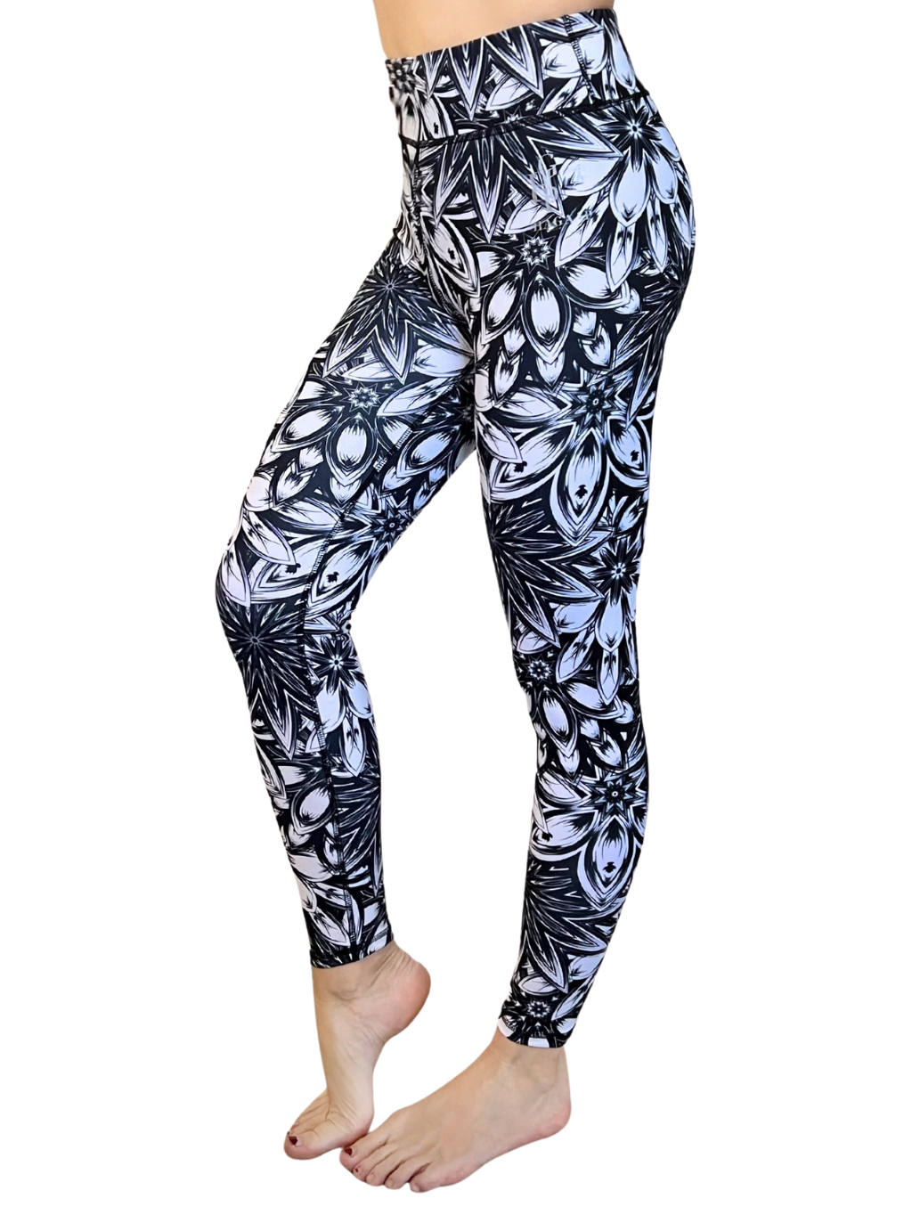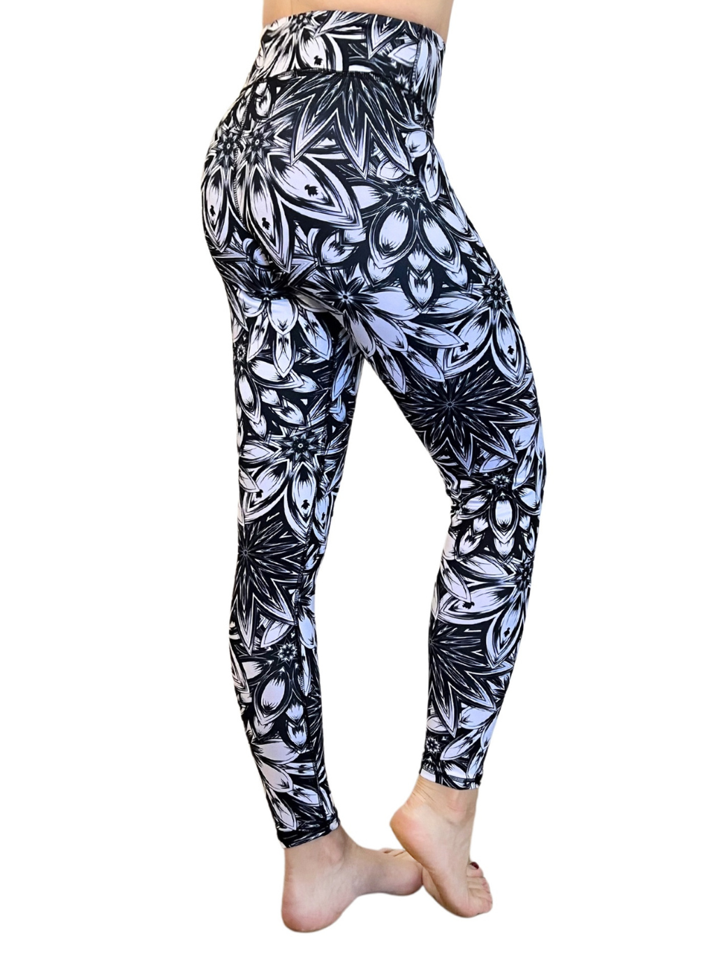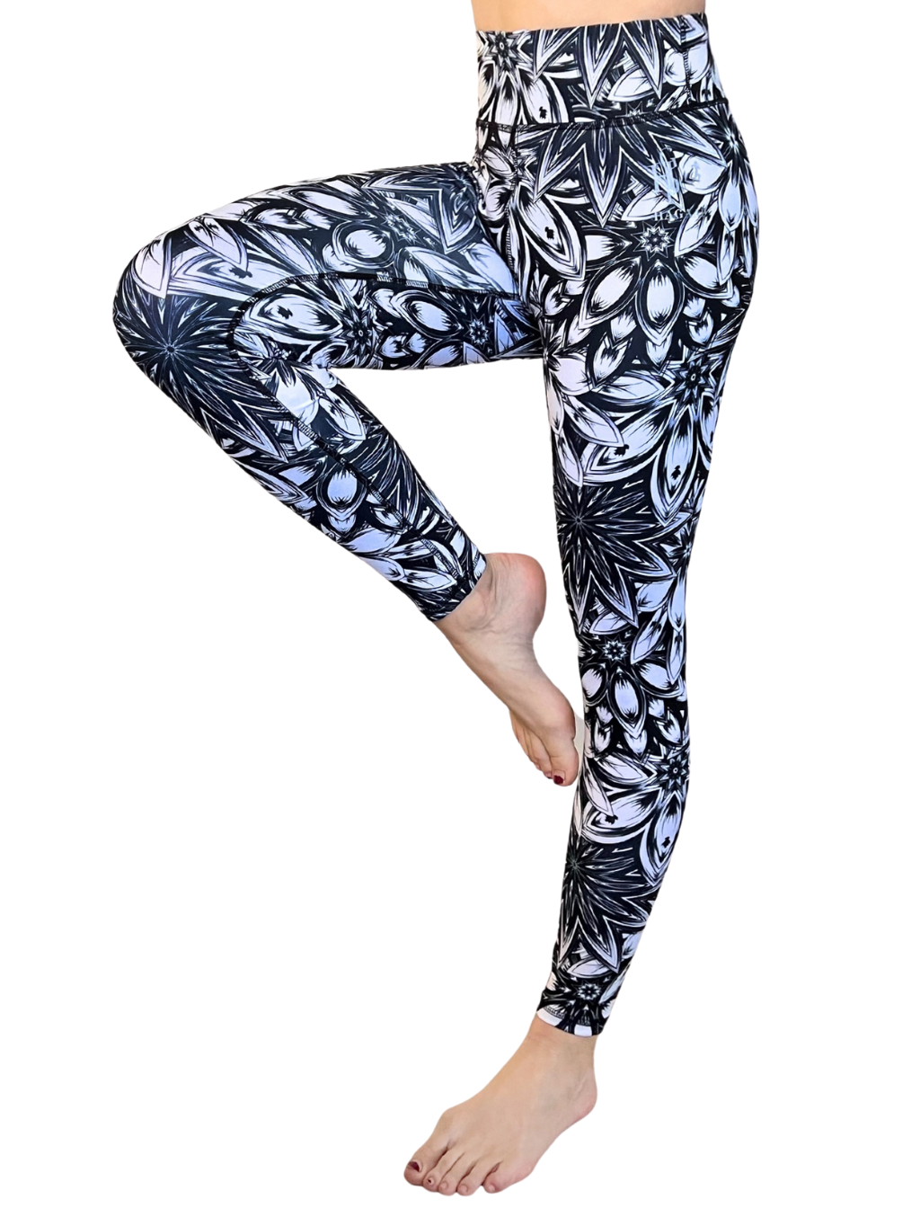 Dámské sportovní legíny s vysokým pasem a výrazným černobílým květinovým vzorem. Perfektně přiléhají, jsou pružné a pohodlné ideální na cvičení i volnočasové nošení. Střih má  vysoký pas, zpevňující břišní oblast, přiléhavý slim fit střih, délka ke kotníkům.