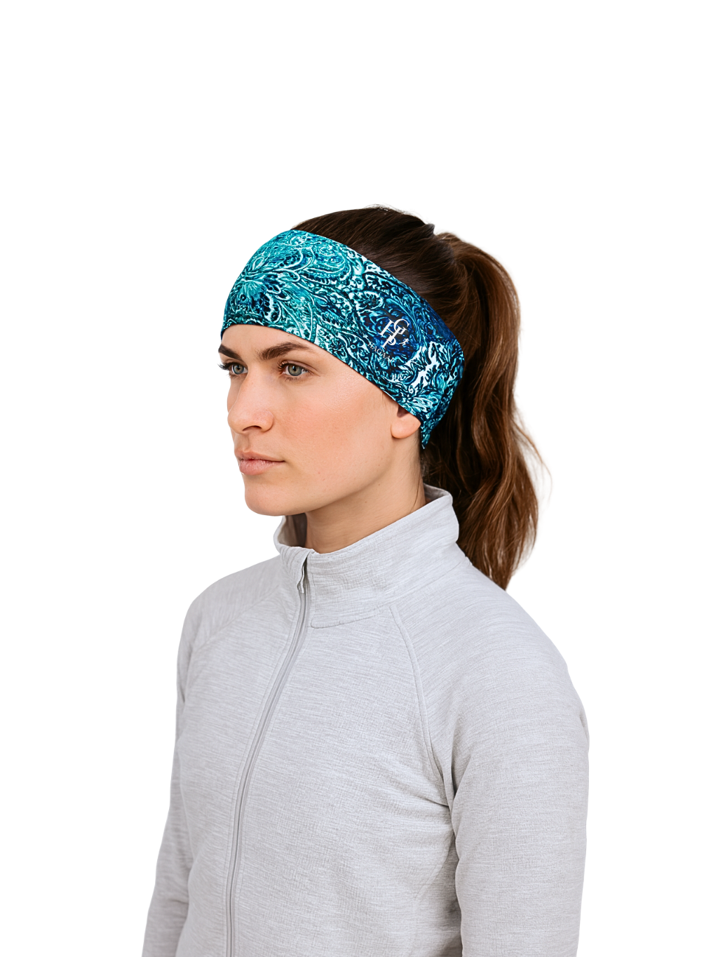 Stylová sportovní čelenka s elegantním damaškovým vzorem v odstínech modré a tyrkysové. Skvěle drží, odvádí pot a dodá tvému outfitu šmrnc při každé aktivitě.  Ideální pro běh, jógu, cyklistiku i každodenní nošení. Skvěle sedí, chrání před potem a vítr tě už nezaskočí. Pro pohodlí  při maximálním výkonu.