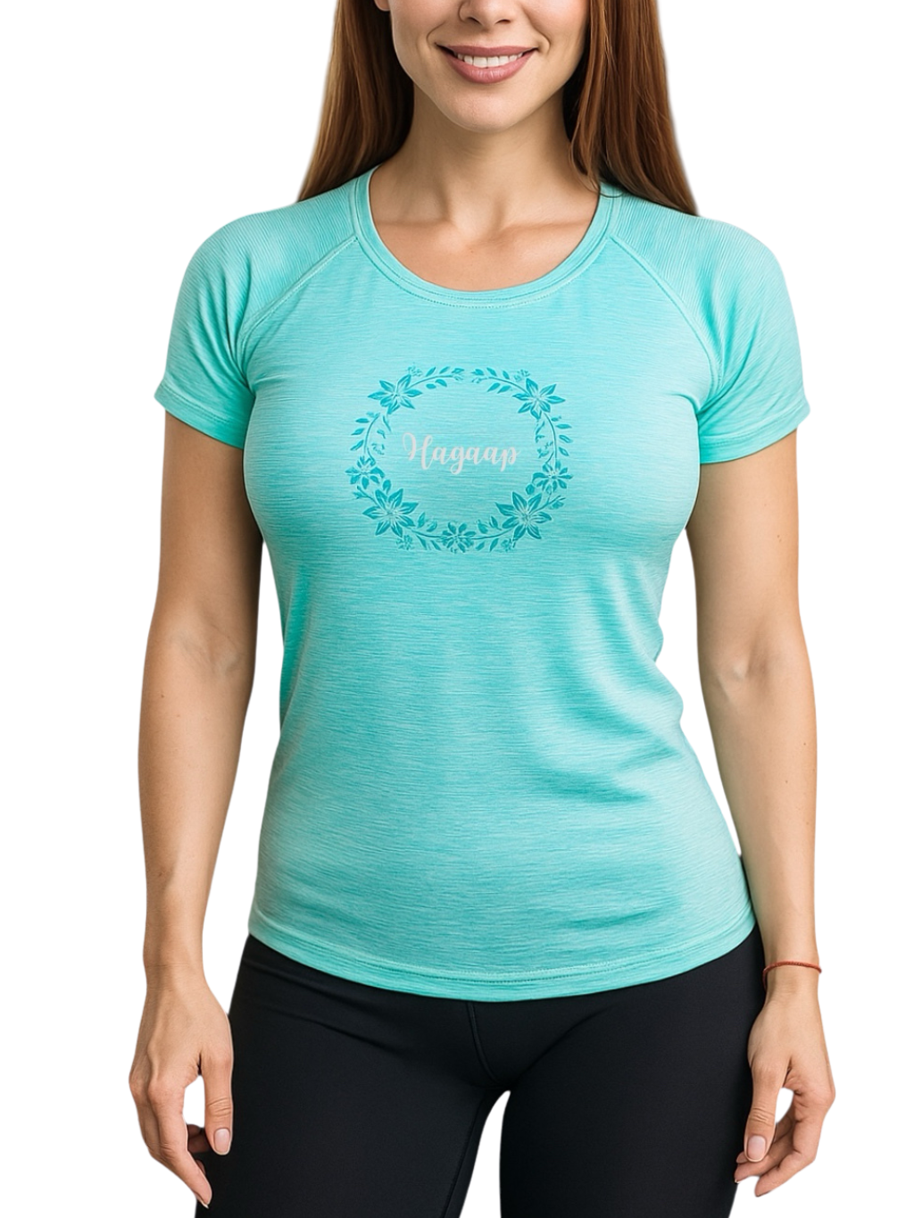 Raglánové krátké rukávy umožňují plný rozsah pohybu, zatímco střih se zeštíhlujícím efektem elegantně zvýrazňuje ženské linie. Světlý melírovaný tyrkysový tón dodává tričku svěžest a energii.