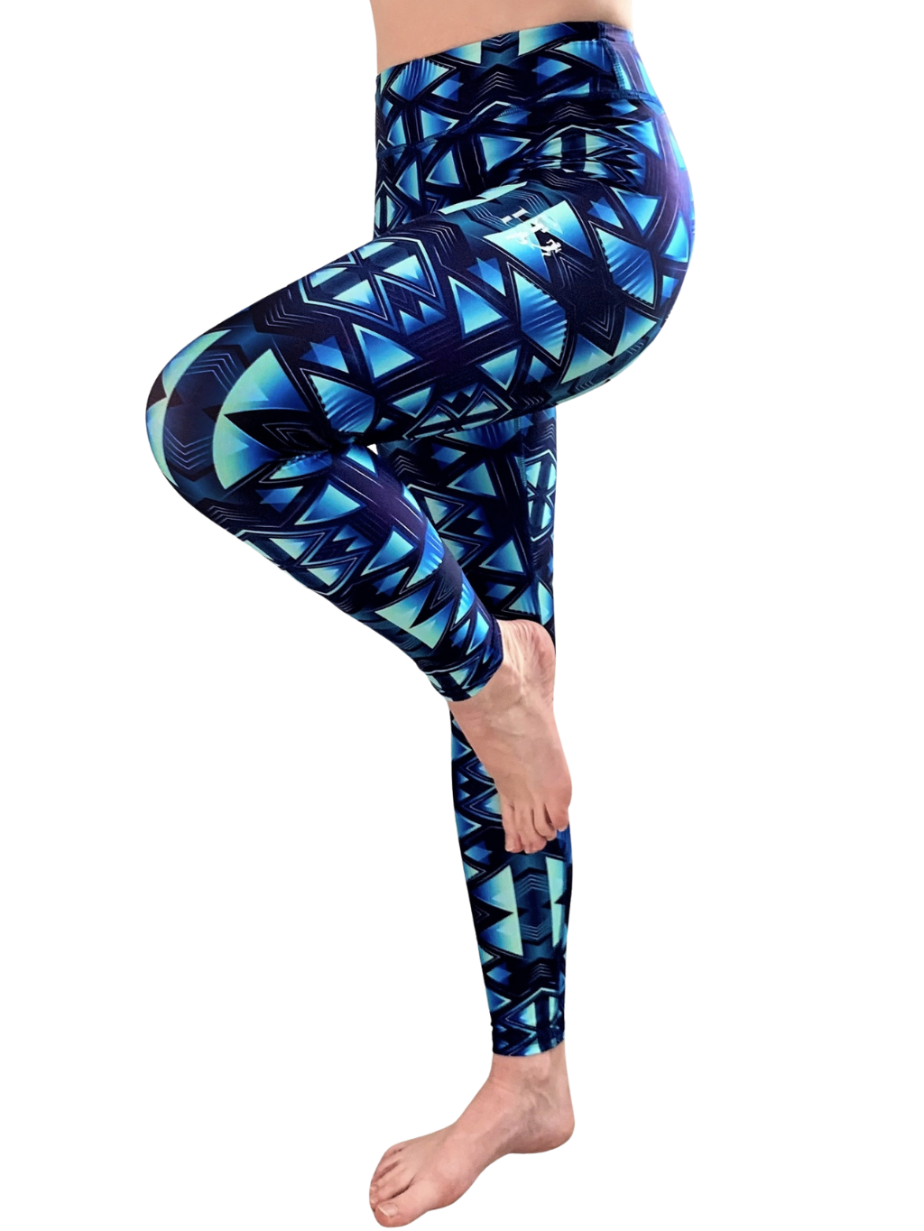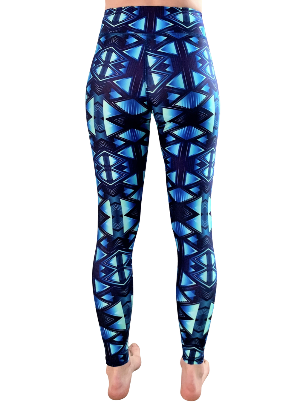 Stylové legíny s elegantním vzhledem a nevšedním designem modrých geometrických tvarů. Vyrobeny z příjemného, rychleschnoucího materiálu, ve kterém se budete cítit skvěle a sexy, nejen při sportu, ale i při běžném nošení. Elastické a velmi příjemné na dotek, s vyšším pasem, který vytvaruje hezkou postavu a zakryje bříško. Každý kus má jedinečný design.