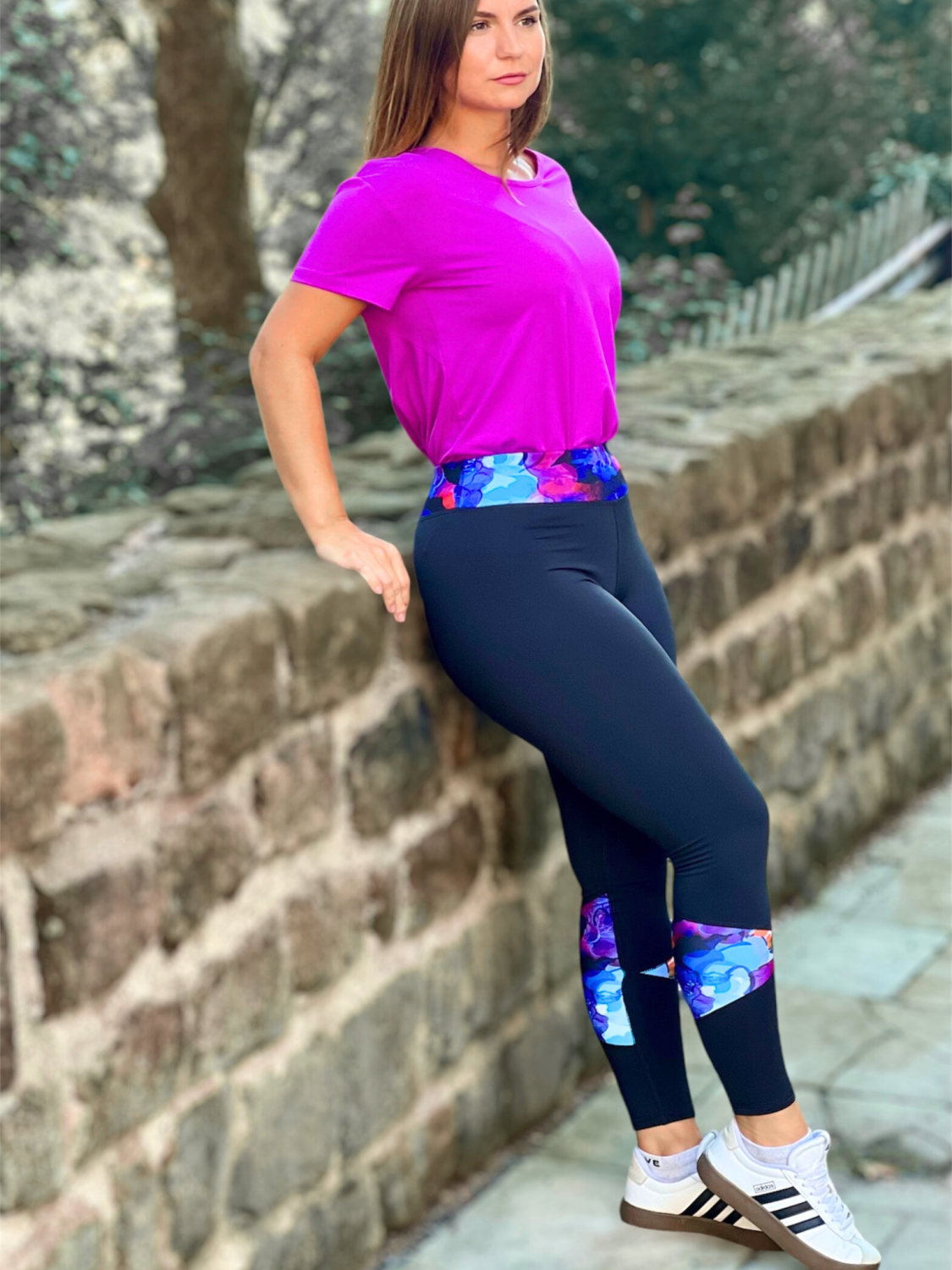 Základní černá barva dodává legínám eleganci a zeštíhlující efekt, zatímco barevné prvky v podobě abstraktních vzorů, dodávají celému outfitu dynamiku a energii. Barevný design je strategicky rozmístěn tak, aby nejen zvýraznil linie postavy, ale také přidal na osobitosti a odlišil vás od ostatních. Legíny jsou navíc opatřeny širokým elastickým pasem, který zajistí pohodlí a pevné držení během jakékoliv aktivity. S těmito legínami budete připraveni na jakoukoliv výzvu – ať už se vydáte na horskou túru, budete trénovat v posilovně nebo jen vyrazíte na procházku po městě.